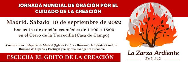 El próximo sábado 10 de septiembre se celebra en Madrid, en el Cerro de la Torrecilla de la Casa de Campo (metro Lago) una oración ecuménica por el cuidado de la creación, en la que participarán el Arzobispado Católico de Madrid, la Iglesia Ortodoxa Rumana y la Iglesia Evangélica Española. Bajo el lema oficial del Tiempo de la Creación «Escucha el grito de la creación» y la imagen de la zarza ardiente (esperamos que no bajo un sol igualmente ardiente), tendremos la posibilidad de compartir, en fraternidad ecuménica, nuestra inquietud ecológica y nuestra oración ante Dios, Padre de toda la creación.