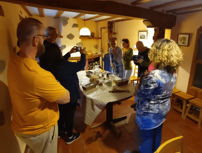 Y tras un pequeño refrigerio, nos pusimos de nuevo en faena, concretando en esta ocasión nuestra reflexion compartida en torno a un aspecto concreto, pero importante, de la vida cotidiana: nuestra alimentación. Primero desde una reflexión motivadora del propio José Eizaguirre, que nos invitaba a sentirnos agradecidos por ese don de la Creación que es «el pan nuestro de cada día, y después desde un tocar, sentir y contemplar cómo esos recursos de la naturaleza se convierten, «con el trabajo del hombre y la mujer», en pan y otras viandas que nos alimentan. En concreto, dedicamos un ratito a amasar el pan y a prepararlo en moldes para que fermentara durante la noche y, al día siguiente, pudiéramos hornearlos para comer, realmente, del trabajo de nuestras manos. Toda una experiencia (espiritual, por supuesto) en relación a algo tan básico en nuestra vida.